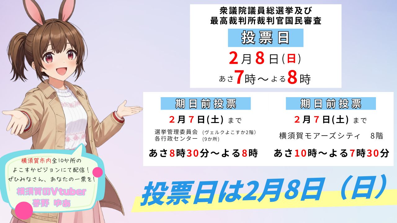 衆議院議員総選挙および最高裁判所裁判官国民審査の投票日は2/8(日)です。